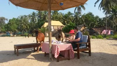 Eine Straße in Indien ohne herumstreunender Kühe, Schweine und Hunde, ist undenkbar. Es gehört einfach dazu und man muss sagen, dass man sich ganz schön daran gewöhnt und es wahrscheinlich in Deutschland vermissen wird. Es gibt keinen Tag, an dem keine Kuh nah an einem vorbeischlendert. Manchmal kann es einem passieren, dass sie einen anstupst und man erschrickt. Aber meist ist sie die Ruhe in Person. Ein Allesfresser, der wirklich alles isst. Aus den Mülleimern, auf der Straße, Plastik wird auch eingenommen und wenn sie Glück hat, bringt ihr noch ein Passant einen Strauß an frischem Grün, denn die indische Kuh ist ja bekanntlich heilig und es bringt Glück, wenn man sich um sie sorgt (bloß nicht essen!). Es ist schon faszinierend, mit welcher Selbstverständlichkeit die Kuh im Straßenalltag lebt und weilt und immer wieder schöne Geschichten hervorbringt: Sie steht mitten auf einer riesen Straße und alle Autos und alle sämtlichen Gefährte wie Tuk-Tuks, Rikshas, Motorräder, alte Fahrräder, Karren und auch Passanten passieren an den Kühen vorbei, professionell und geschickt. Die Straßenverkäufer vertreiben mit Routiniertheit die Kühe von ihren Straßenständen, wo sie Gemüse und Obst verkaufen - immer mit einer Gelassenheit, bestimmt, aber nicht aggressiv. Die Leute halten oft das Gatter vor dem Haus geschlossen, denn es könnte ja eine Kuh in den Garten schlendern. Selbst der Strand ist nicht frei von Kühen und hier in Goa suchen sie sich Wärme über die Nacht und liegen breit und bequem am Strand.