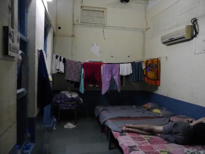 Kleidung und Bettwäsche werden in der Unterkunft auf dem Boden getrocknet:
