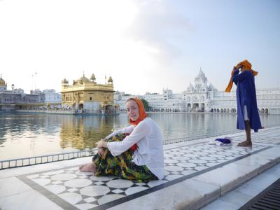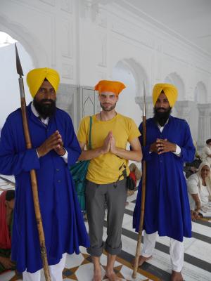 Amritsar ist die bedeutendste Stadt der Sikhs. Denn hier befindet sich der Goldene Tempel, die heiligste Stätte für die eigene indische Religionsgemeinschaft der Sikhs. Auf der Straße werden wir mehrmals von verschiedenen Männern angesprochen und nach einer kurzen Frage zu unserer Herkunft wird unmittbar gefragt, wie wir den Tempel fänden. Wir waren begeistert von der Tempelanlage und sagen, wie schön wir ihn finden. "Es ist auch dein Tempel. Es ist der Tempel für jedermann, unabhängig von der Religion, der Herkunft, der sozialen Stellung oder des Geschlechts". Sie sagen dies mit solcher Hingabe, dass man gerührt ist und sich erfreut, dass man Teil an dieser Pilgerstätte sein kann. Die Sikhs haben uns sehr beeindruckt. Es sind große Männer und Frauen, gehen aufrechter als die Hindus, tragen einen Turban (nur manche Frauen tragen auch einen Turban) und alle tragen einen Silberreif am Arm und einen Dolch an der Seite. Sie strahlen eine Ruhe aus, einen gewissen Stolz und wenn man sie anlächelt, lächeln sie freundlich zurück, auch wenn sie an sich immer eher ernst schauen.