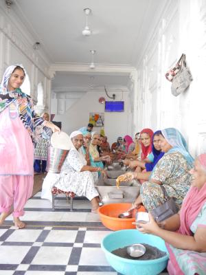 Tausende an Menschen gehen jeden Tag ein und aus zu diesem Tempel. Der Tempel ist die ganze Nacht offen. Die Menschen können dort eine Nacht schlafen - die meisten schlafen auf dem Boden unter freiem Himmel, andere in Unterkünften- und sie essen auch dort. Das gemeinsame Essen ist eines der wichtigsten Rituale in dieser Pilgerstätte. Man geht in ein Haus, erhält einen Teller, einen Löffel und eine Schale für das Trinkwasser und man geht nach oben, stellt sich an, um anschließend in einen großen Raum zu gehen. Dort sind schmale lange Teppiche ausgelegt, auf die man sich im Schneidersitz setzt; den Teller stellt man vor sich auf den Boden. Schnell kommen die Sikhs mit Eimern und schütten kelleweise die verschiedenen Soßen in den Teller. Man hält dankend die Hände offen und es wird einem Brot in die offenen Hände geworfen. Sie sind schnell und rasen zwischen den Hunderten Menschen vorbei, füllen die Teller, füllen sie nach, bis wirklich jeder satt ist. Danach steht man auf, es wird hinter einem schnell geputzt bist die nächsten Pilger sich zum Essen setzen. Man geht wieder hinunter. Unten gibt man die Teller ab und man sieht hundert Menschen die Teller spülen. Es sind alles Freiwillige. Nebenan schälen duzend Freiwillige Zwiebeln und die Zwiebelschalen liegen auf dem Boden zerstreut. Es ist ein so optimales Management, das uns beeindruckt. Es ist unglaublich wie sie mit den Menschenmassen umgehen, wie sie das koordinieren (Tag und Nacht). Mir war bis jetzt nicht bewusst, wie komplex das Pilgermanagement sein kann. Das Essen ist im Übrigen umsonst. Es ist sehr einfach, aber es ist gut. Es wird in riesen Töpfen zubereitet. Spenden sind natürlich wichtig und es wird viel gespendet. Solche Sikh- Essen werden auch woanders umsonst angeboten. Wir hatten beispielsweise im Zug nach Chandigarh ein Essen umsonst erhalten.